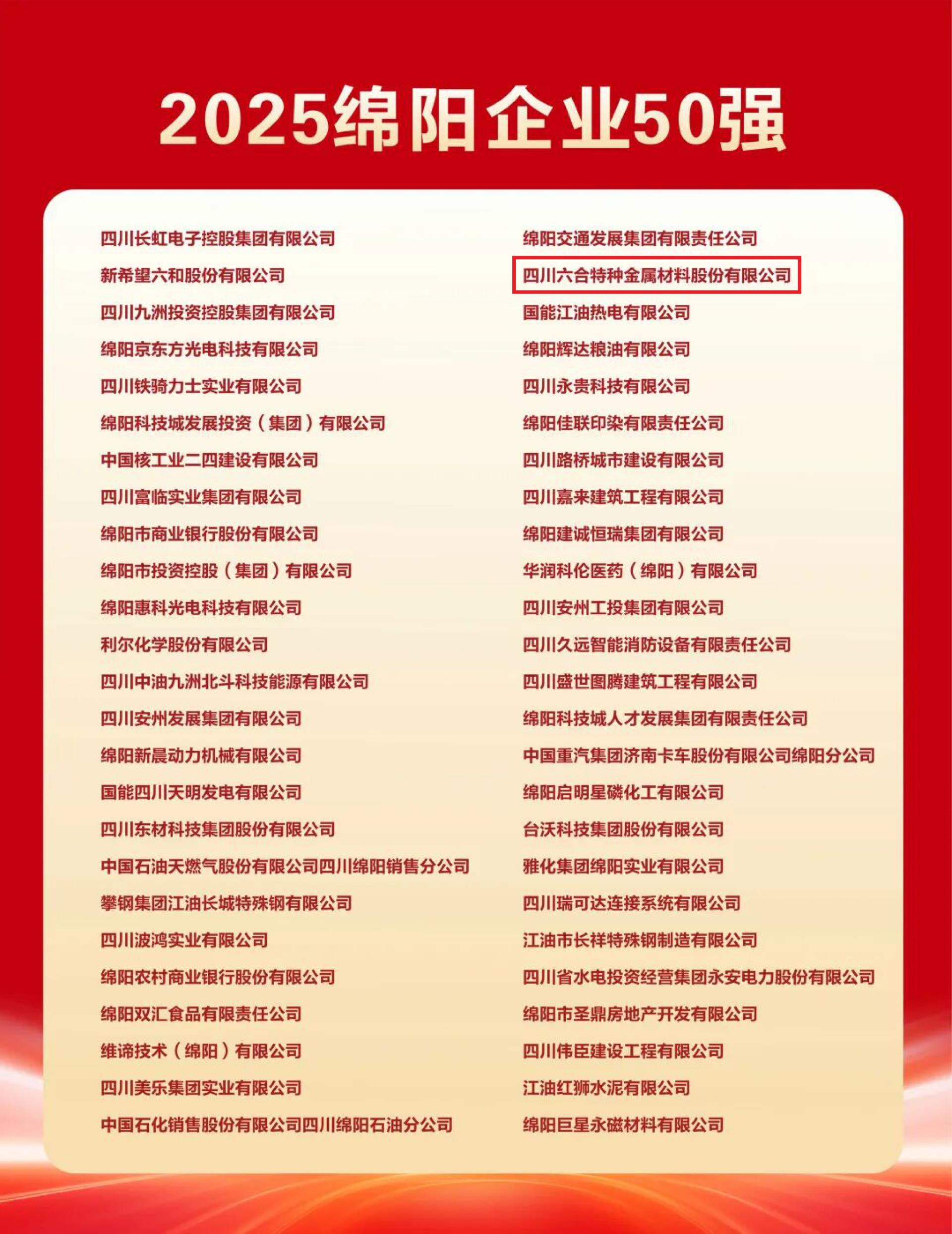 10 月 24 日,2025 绵阳企业 50 强发布会在四川绵阳工业园举行,四川六合特种金属材料股份有限公司(简称 “六合特材”)凭借特种金属材料领域的技术突破、稳健经营与产业贡献,成功入选,成为先进材料产业标杆。